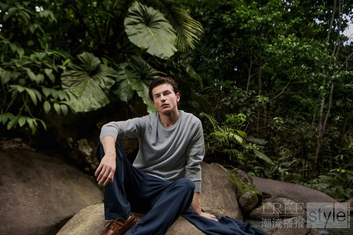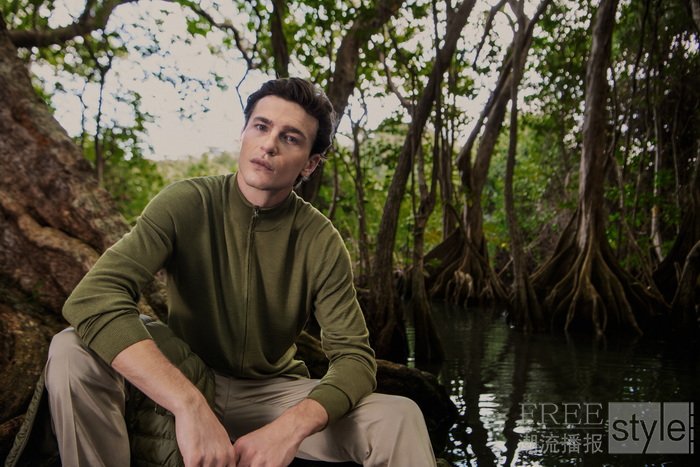 Falconeri 超细羊绒(Ultrafine Cashmere)仿佛第二层肌肤,轻盈、控温、透气且触感极致柔软,自如应对多变的气候与生活节奏,以其纯净质感,为穿着者带来沉浸式的感官体验。海蓝宝石色圆领针织衫、剪裁利落的裤装、丛林绿色拉链开衫以及海军蓝工装裤,在繁茂热带植被的映衬下,更显当代都市人的精致格调,无畏四季更迭。