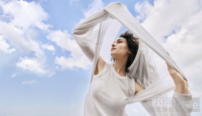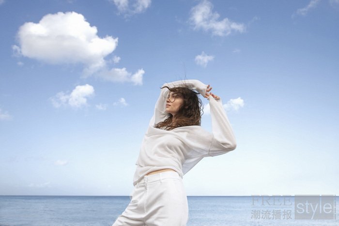 作为三大纱线中最轻盈的一款,云柔羊绒(Airfine Cashmere)灵感源自天空与清风,近乎无重且通透,同时坚守功能性,以自由姿态包裹身体。大片中,纯白V领针织衫与同色背心随风舒展,轻盈叠搭传递舒适、自由与纯净意境。