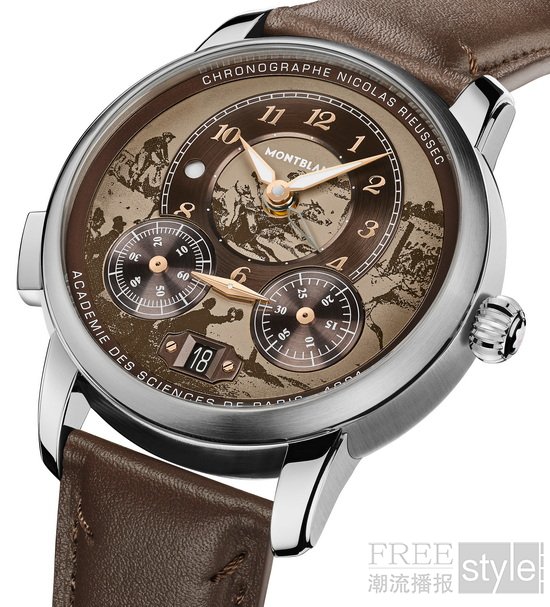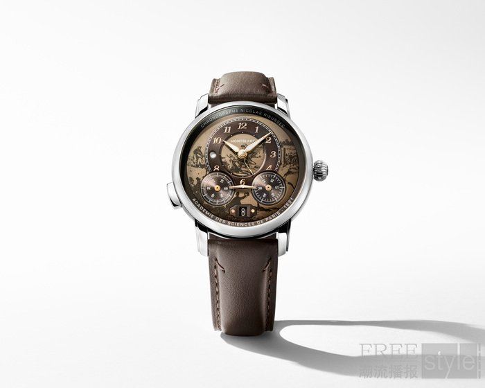 该款腕表延续了最初滴墨式计时器的经典设计,表盘之上设有两个小表盘,60秒秒针盘居左、位于“8点钟”位置,30分钟计时盘居右、位于“4点钟”位置,两个穹形小表盘水平对齐并分列两侧进行旋转,立体的双向指针悬置固定于两个计时盘中间,以指示所经过的时间。这一布局精准复刻了尼古拉斯·凯世于1821年创制的首款滴墨式计时器的构造。