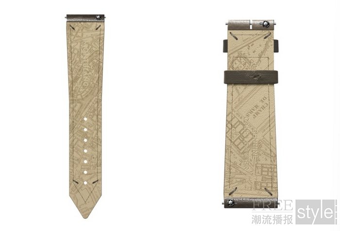 表带内衬更特别融入了巴黎地图,诸多重要地标皆可从中寻见踪迹。熟悉巴黎的腕表藏家可辨识出巴黎市中心的巴黎圣母院与塞纳河,还有1805年至1817年间尼古拉斯·凯世设立工坊的帕吕市场大街14号(14 Rue du Marché-Palu),以及他为滴墨式计时器申请专利期间的工作地小田园新街13号(13 Rue Neuve des Petits Champs)。表带上方区域地图还饰有1821年9月1日那场著名赛马赛事的举办地、见证传奇滴墨式计时器诞生的巴黎战神广场(Le Champ de Mars),以及法国高等军事学府巴黎军事学院(L'Ecole Militaire)。