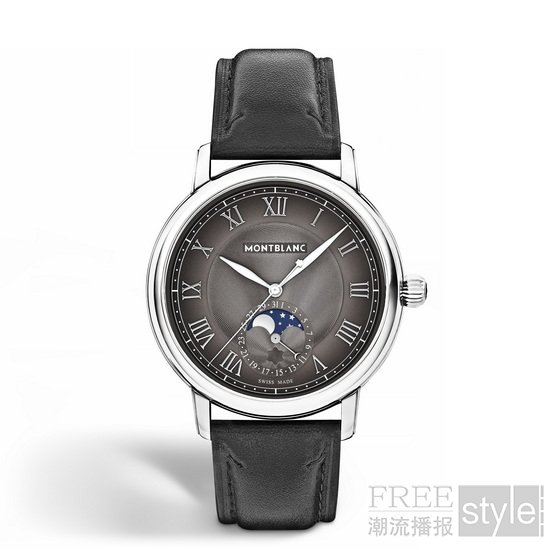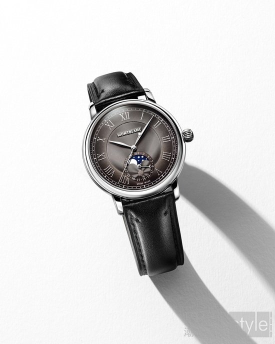 万宝龙明星系列月相腕表 墨韵灰与明星系列计时码表 墨韵灰均配备缝线黑色小牛皮表带,表带采用渐变墨韵工艺制成,由表耳处的黑色向末端墨韵灰自然过渡,风格独具。