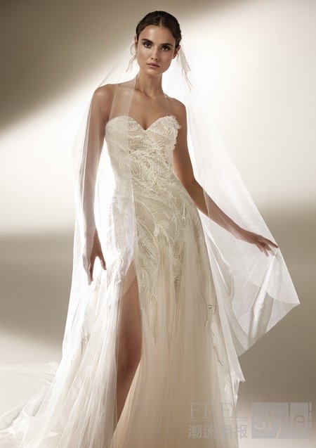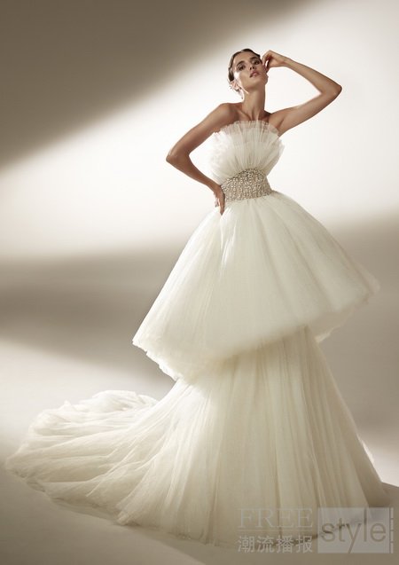 繁复华丽的长袖:各款灯笼袖和加衬衣袖可谓正装款礼服系列的瞩目亮点,其廓形设计充满巧思:采用饰以花卉刺绣的绉纱面料,配套披肩搭配长款裙裾,或以玫瑰金细珠呈现造型。