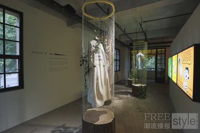 快闪店以《花生漫画》作为装饰灵感,门口停着的一辆SNOOPY巴士,瞬间将嘉宾带回那个童趣快乐的漫画世界,预示着派对即将开启。店铺共设置三层展示空间,以巧思妙想的设计,演绎从夏日到秋天的季节流转。踏着印有SNOOPY金句的石阶进入快闪店,一楼的展厅中,打破空间格局,将陈列橱窗的有机棉花田延伸到室内;小小的“鲜花市场 ”、花墙等布景,勾勒出属于自我的浪漫;更引人注目的是用品牌产品所搭建的室内廊柱,不仅充满创意,更显示出broadcast播一直以来的环保理念。