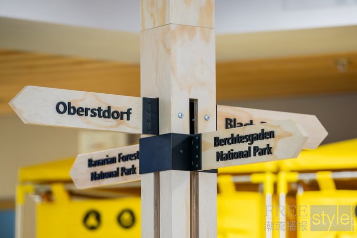 攀岩绳、帐篷、岩石、木桩这些经典户外元素一下将大家从现代都市带入自然户外,收银处的标志牌指向德国贝希特斯加登国家公园的位置,仿佛下一秒即将出发感受自然。