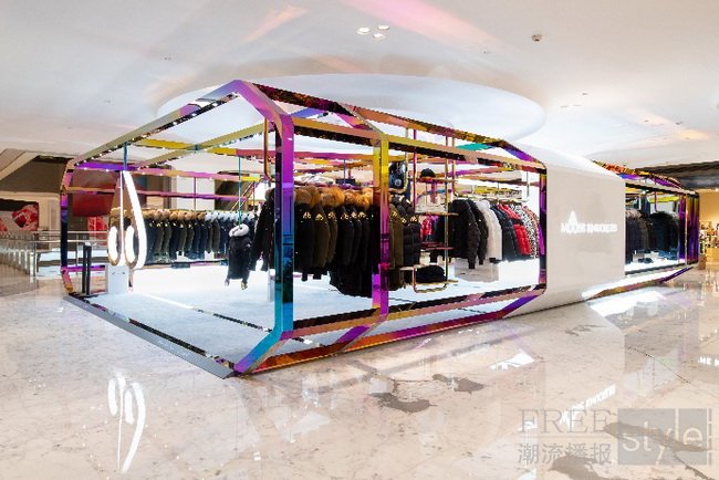 Moose Knuckles全新北京SKP限时精品店以全钢质结构打造,整体框架饰以炫彩镜面效果,在灯光下从各个角度折射出不同的光彩,恍若美轮美奂的极寒美景中传递出我们对保暖品质的无尽追求。限时店内中心以19块LED屏幕错落叠搭的电子装置,滚动播放Moose Knuckles2020年秋冬系列全新广告大片,营造新奇沉浸的视觉体验,引导顾客全身心体验Moose Knuckles的炫酷世界。