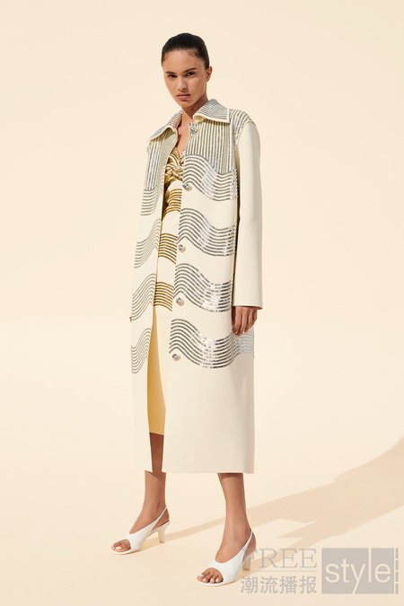 用 Bouclé 编织法的半身裙和短裤宣告回归短裙时代,炫彩的花呢材质能捕捉并反射美丽光晕,以美洲 Margay 动物纹理织就大圆领连衣裙、夹克和紧身长裤的造型。五个口袋造型的上衣以粗花呢裁剪而成,采用亮片针织面料,从白天到晚上都同样闪耀美丽,尤其在晚上穿着更加动人。手工刺绣的晚装在外套上与连衣裙相得益彰,柔软的小羊皮制成的新月切面凉鞋是完美造型的理想鞋款。