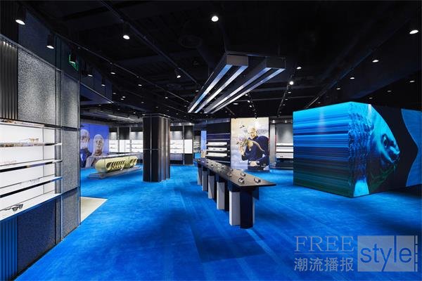 三层是展览空间,包含由GENTLE MONSTER所策划的空间陈列,以及品牌合作限时空间。 空间中心正在展出的艺术装置群以 “The Giant Who Arrived at the Bird Village (探访飞鸟部落的巨人)”为主题,中间摆放着Gentle Monster机器人实验室所创作的大型机器人——“THE GIANT(巨人)”,象征错位的时空和无垠的想象力。限时空间的展览内容会不定期更换,首个展览为GENTLE MONSTER制作的多媒体交互艺术——“Error in the Beat (节奏错位)”,墙⾯上的舞者会根据来访者的动态与速度给出回应,呈现不同的舞蹈动态,这也是GENTLE MONSTER在多媒体数字艺术上全新的尝试。同时,该层还拥有⾸个GENTLE MONSTER线下维修中心。