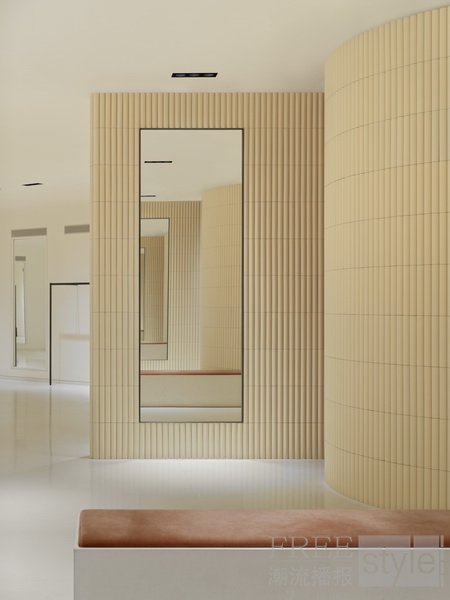 庄严感是这个空间的核心所在。一进入店内,映入顾客眼帘的是由陶瓷装饰而成的圆形立柱和楼梯。所有的地面和建筑细节都由石灰石制成,而墙壁与天花板亦使用了同样材质的涂层,使得整个空间在质感与色调中达到和谐统一。店内的双层空间构造各异,建筑师将一层宽阔的空间划分成了多个子空间,而二层展示区域则居于中心,成列排开,体现出别致的结构感。中心展区背后的空间则由陶瓷装饰而成的展厅与相对独立的龛室构成,龛室的墙面设计深受中国传统纵横交错的木结构启发。取材自然的建筑原材料与极简主义风格的细节形成强烈的视觉表达,并与简洁的空间设计线条相呼应。