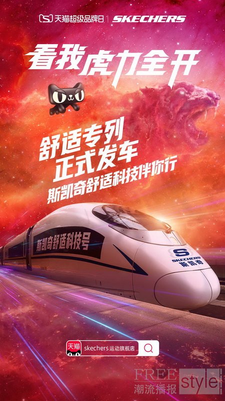 据悉,乘客可扫描斯凯奇舒适专列内海报上的二维码,进入【天猫skechers运动旗舰店】参与游戏,收集斯凯奇超级虎币,赢取天猫超品日福利。