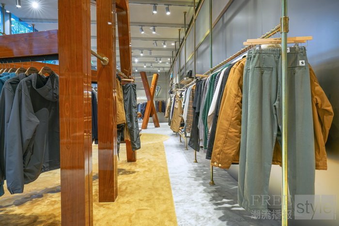 与全球最新 Carhartt WIP 品牌店的设计概念与调性一脉相承,以水泥板为主搭建的空间,配合幻金色层架,呈现简约的质感与现代工业风格。店内利用不规则的胡桃木组架系统穿梭陈列空间,贯穿全店提供视觉空间的分隔,构筑极具工艺感的轮廓线条,呈现 Carhartt WIP 的实用美学。