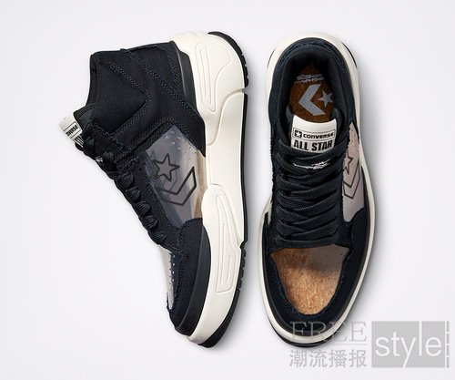 在Chuck 70鞋款的设计上,Tyvek®材料制成的拉链护罩之下是隐匿其中的印刷波点帆布分层鞋面,这也是对Joshua作画时穿着的巧妙映射。鞋款随处可见设计巧思,卷尺图案的鞋带充满创意;鞋头处特别设计了油漆溅射图案;内衬结合双方品牌Logo标志的软木鞋垫;棉质鞋带上印有独特的卷尺图案;而半透明大底之下绘有别致的工具和硬件图案。