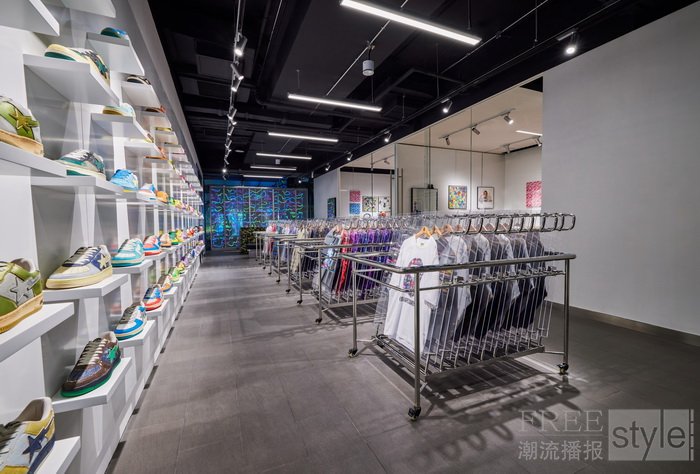 展览现场特设商品专区,40双BAPE STA™以及多款球鞋新品筑成缤纷艺术鞋墙,部分鞋款及服饰现场发售。