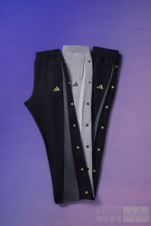 长袖T恤的设计更具运动感,胸前有蛇盘篮网的图案,同时运用了渐变效果,CLIMACOOL科技加持的面料,让衣服更适合运动时穿着;裤装方面,这次2025农历新年系列带来了篮球赛场上常见的排扣运动长裤,以黑色呈现,加入细节的蛇纹图案和金色纽扣装饰,简约经典。