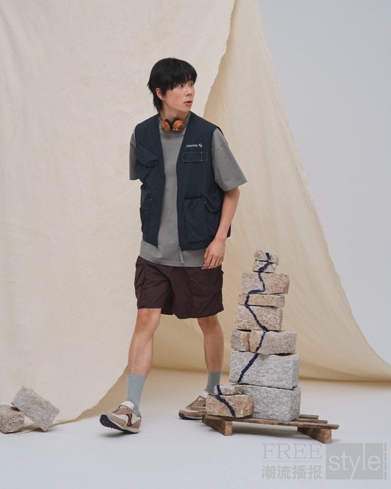 该组系列以都市生活的流动性为灵感,梭织外套与马甲融合立体剪裁与功能性结构,打造兼具实用性与时尚感的造型。宽松版型设计更具包容性,衣身立体模块化口袋设计,不仅增强储物功能,更塑造出层次感;后背解构设计提升透气性的同时,更使服装在都市生活穿搭场景中更具动感活力;左前胸口袋上方点缀品牌标识性 Logo,细节之处也尽显品牌独特风格。