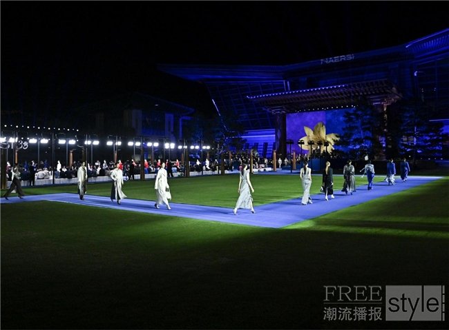 秀场设计以“加冕礼”为核心,选址于世界级峰会的国际会都——北京雁栖湖国际会议中心上演,时尚与自然、人文艺术在此交织加冕盛宴。NAERSI标志性25°蓝渲染夔龙纹迎宾道,象征通往荣耀的加冕之路。秀道中央百合艺术装置匠艺盛绽,为女性献上优雅冠冕。曾创编百余部国际大型音乐会作品的著名作曲家李勋先生受邀作为大秀音乐总监,以交响乐团奏响典雅乐章,与立体光影秀形成视听共振,营造出古典歌剧院般的典雅氛围,模特们身着优雅臻装从容缓步,经典与创新在同一空间碰撞、交融,绽放内蕴女性优雅精神的时装风尚。