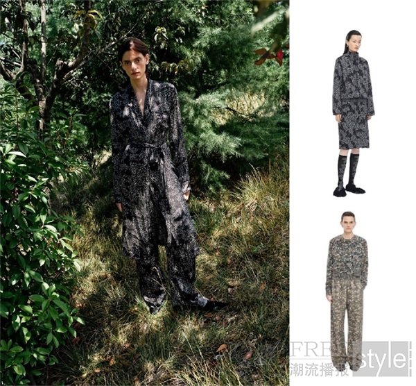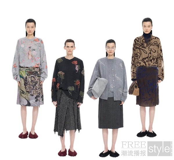 柔软的提花马海毛毛衫,细腻的织物纤维让图案多了一层朦胧感,如同月光映照,安静又舒展。极简风灰色开衫套装,通过水墨晕染的水波纹烫钻这个灵动细节平衡精英感的严肃,凸显「简约即高级」;暗调线条植绒衬衫与同色系长裙的组合,让自然意象在低调中流动;长袖提花套头针织衫配以不规则褶皱半裙或东方皮影半裙,让传统皮影元素成为视觉焦点,兼具叙事感与吸睛度。
