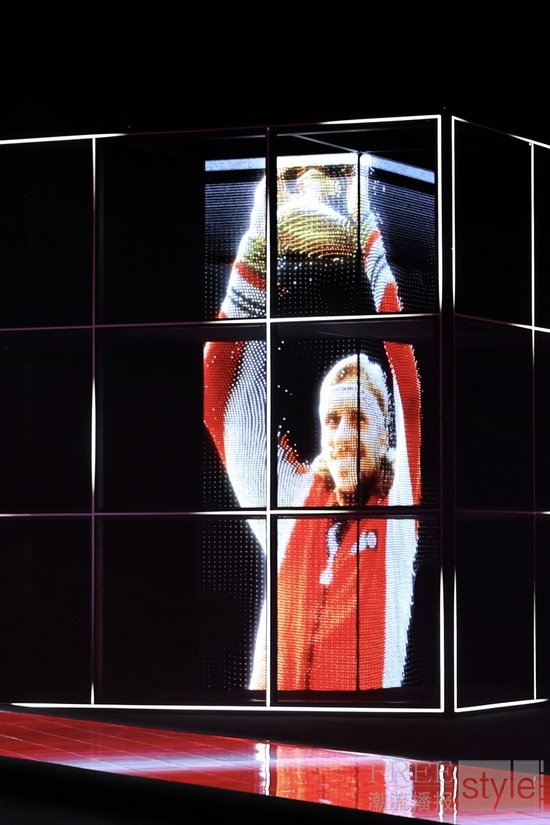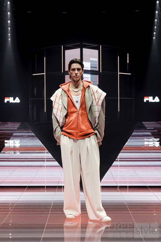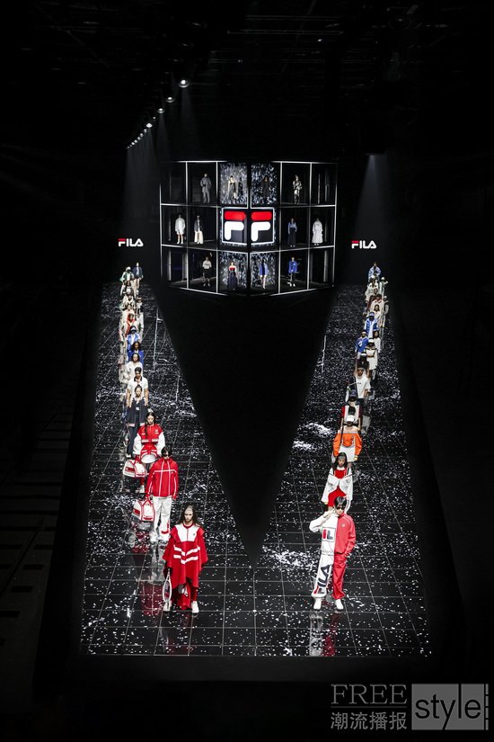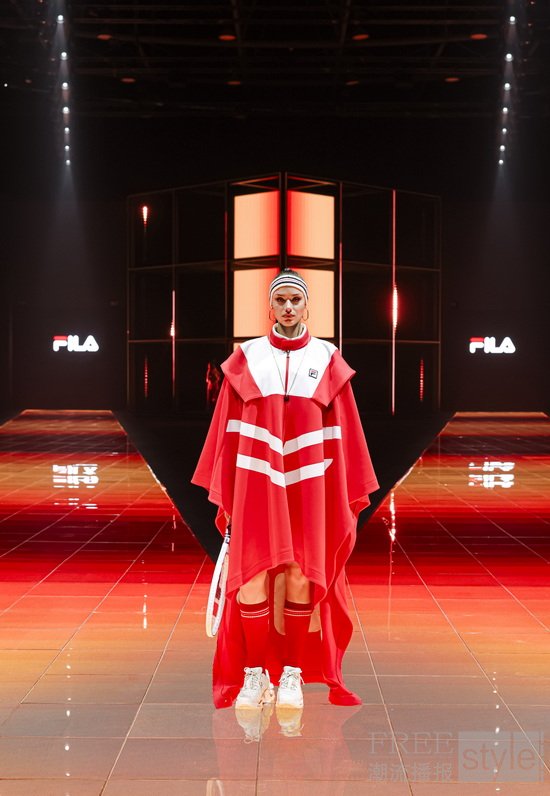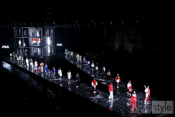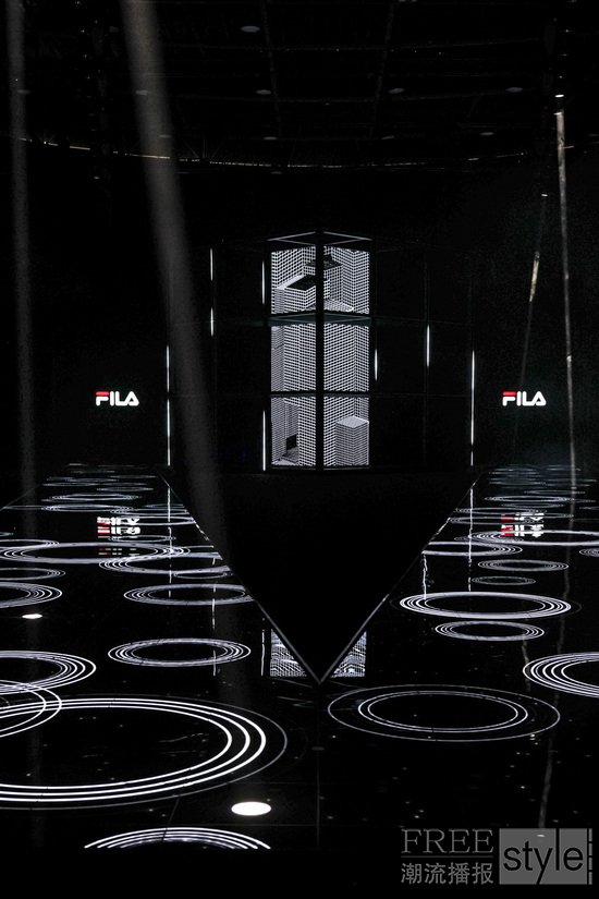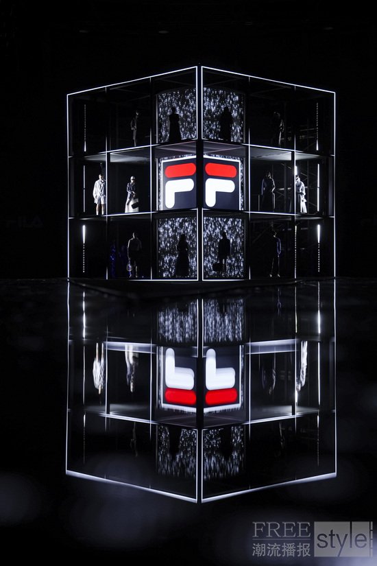 “胜利需要天赋,但传奇需要风格。”这句源自瑞典传奇球王比约·博格Björn Borg的名言为大秀开篇,也是大秀主题“自成一格”的生动注脚。在大秀现场,中心矗立的巨大FILA F-BOX装置延展出V型秀道,荧幕与T台上遍布以网球场的格网为灵感的线条,“看不见的网球”在挥拍声中呼之欲出,构筑出一个多维立体的概念性“球场”。
