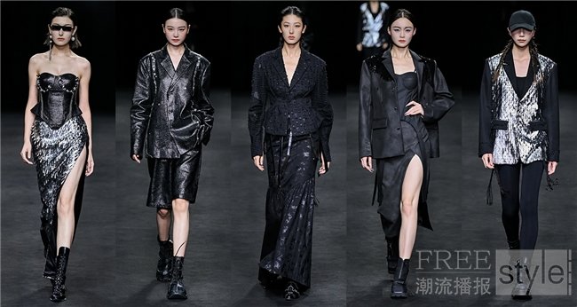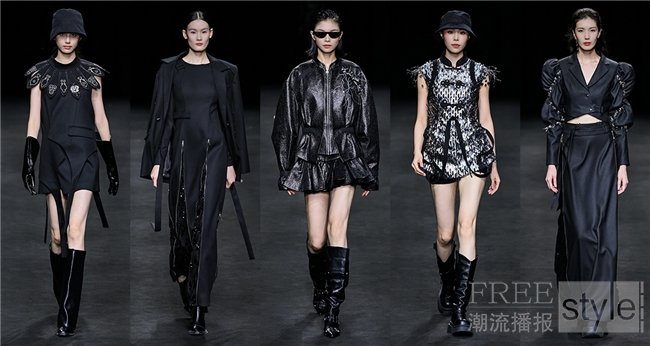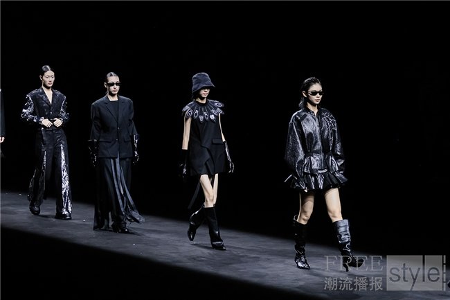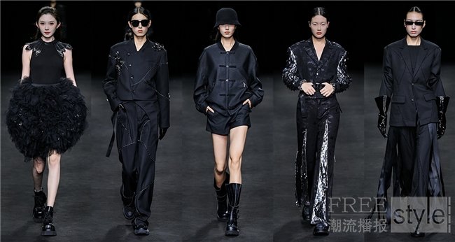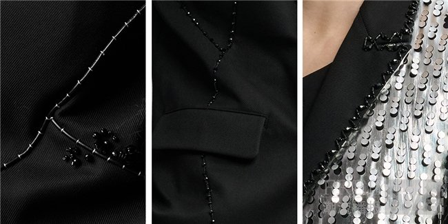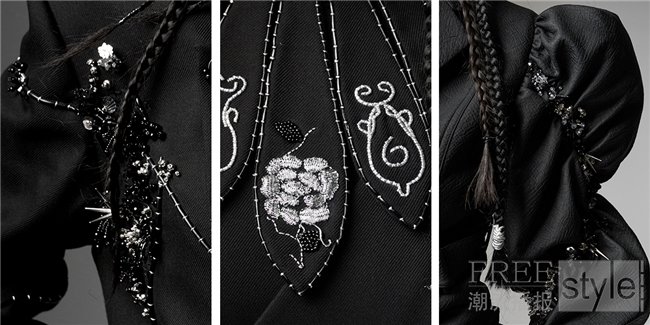 这次ESA用传统非遗文化——潮绣,将我们带入了一种更古老、更智慧的生命秩序当中。传统潮绣中针法繁复,变化万千,在新一季的作品中,运用垫高绣、盘银绣、钉线绣、珠绣等技艺,让一千多年的古老潮绣挣脱经纬的规训,表达出“活着的呼吸感”。立体珠绣和立体亮片绣将细密的珠片排列成各种花卉形状,每朵花都仿佛在阳光下微微颤动;非遗等技艺制作成的图案并不拘泥于表达某些特定民族,ESA希望在自己的作品中体现更多元化的艺术概念。在黑色材质上使用亮片平绣和创意亮片工艺技法,让每一片亮片不再囿于静态,转而随着身体摆动成为波光粼粼的深邃银河。手工串珠更像是夜空中泼墨的星轨,文明的碎片在廓形中相互冲撞;手缝盘扣工整对称,而珠子锁边绣又让整个设计充满了流动的美感。整体采用的大面积黑色既是落花后一切都将归于尘土的短暂结束,也是对生命伊始的回应,或许带着些不安,却依旧充满力量。