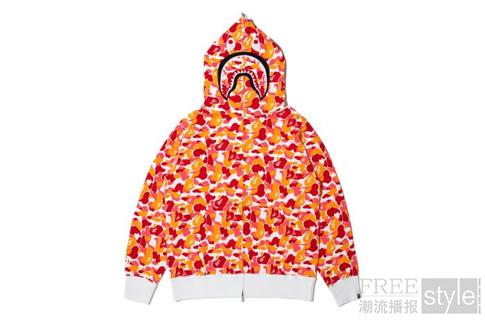 纪念首次进驻重庆,BAPE®以热情奔放的城市底色为灵感,采用炽烈橙、浓郁红、杜鹃粉三色,形成具有浓烈街头色彩的BAPE®重庆限定迷彩图案。搭载重庆迷彩的重磅鲨鱼帽衫将于10月底登陆,献礼雾都本地猿人。