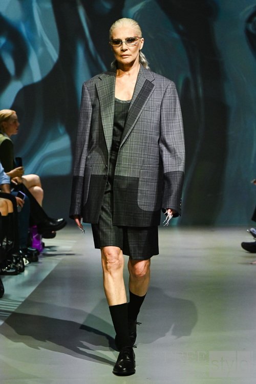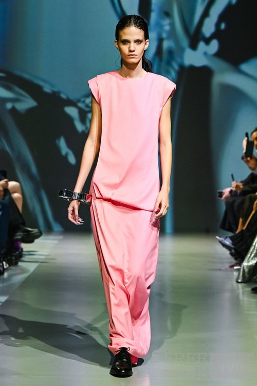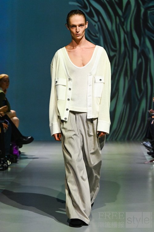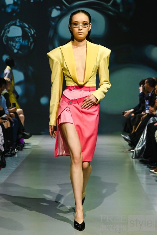 服装本身以笃定之姿承载这种二元性:羊毛西装料、细条纹与正装配饰以传统剪裁语言锚定根基,又解构为梯形几何量感跃入异次元。镀铬皮革与褪色丹宁指向传统革新却未消亡的未来。克制的色彩中跃动明黄与艳粉,同时全新廓形也由此诞生:时髦剪裁与精准打造的廓形达成平衡,在打破比例的同时恪守比例法则。