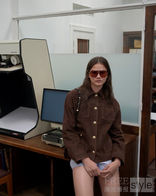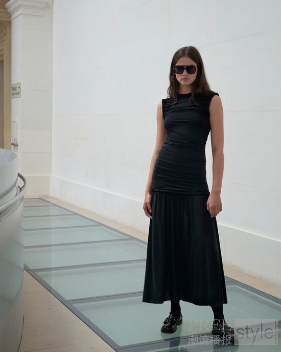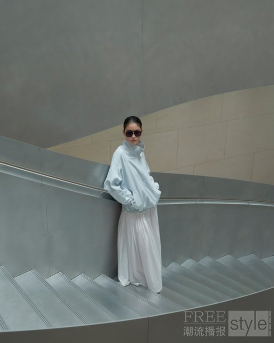 配饰系列延展叙事:极简的七十年代风格太阳镜,以精致的单丝金属框重新诠释了经典飞行员款式。其设计折射出本系列的灵魂,一种更接近清冷大理石矿脉,而非阳光炙烤的海滩,兼具矿物质感与微光气息的特质。