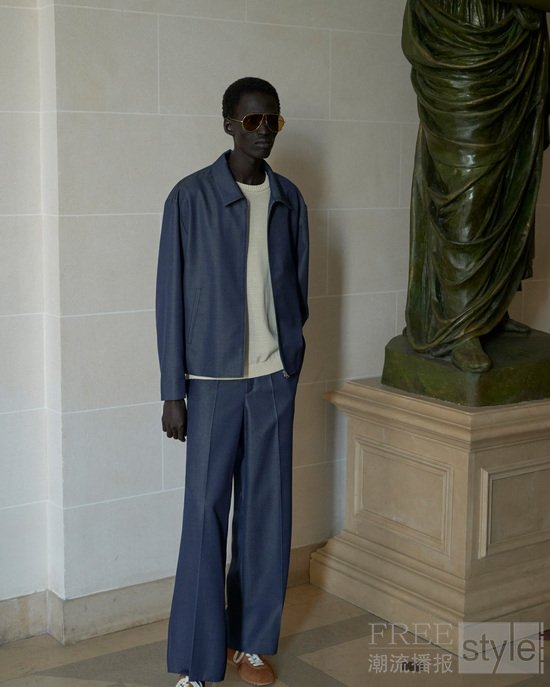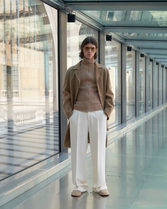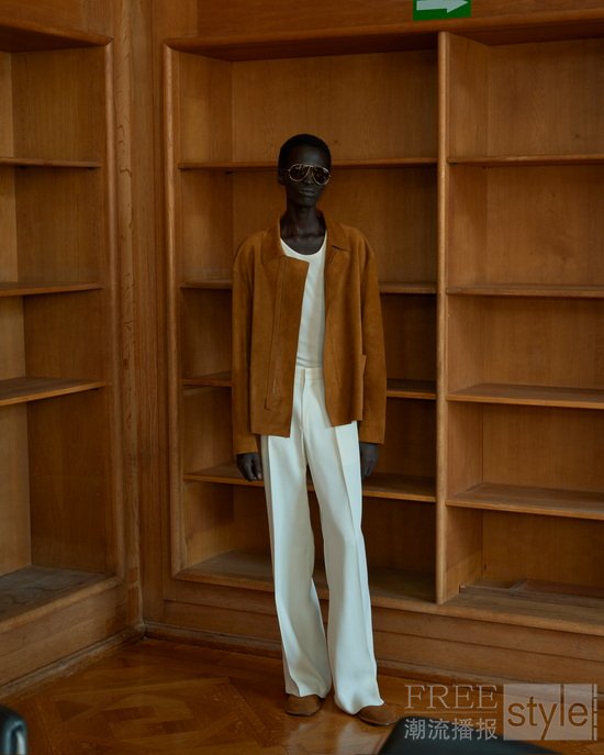 本季色彩谱在拿铁色、奶油白、卡布奇诺棕、米褐色与冷灰间细腻过渡,当中点缀了晴空蓝、麦秆黄与深干邑棕。采用奢华材质,重新定义衣橱经典:一件以真丝取代棉质裁制而成的风衣,或是飘逸长裤与剪裁利落的皮革机车夹克相互呼应。这种柔软感与结构感之间的巧妙互动,塑造出一种内敛的精致韵味,而现代性正藏匿于细节与结构之中。