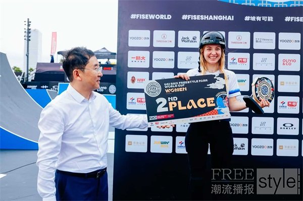 (龙头股份党委副书记、总经理 陈姣蓉女士 为自由式小轮车平地花式世界杯上海站男子组亚军得主颁奖)