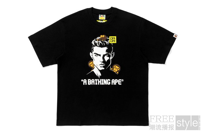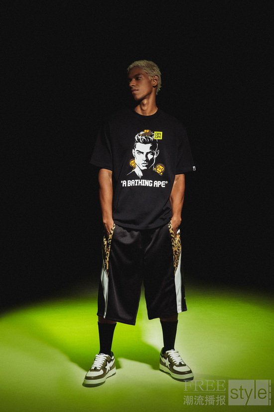 黑白色短袖以标志性APE HEAD为核心创作,将身披葡萄牙国家队红绿战袍的C罗插画形象置入其中,展现其征战绿茵场的矫健英姿。另一款黑色短袖以黑白艺术风格构图,C罗与三只灵动可爱的BABY MILO®️同框演绎,充满玩味意趣。