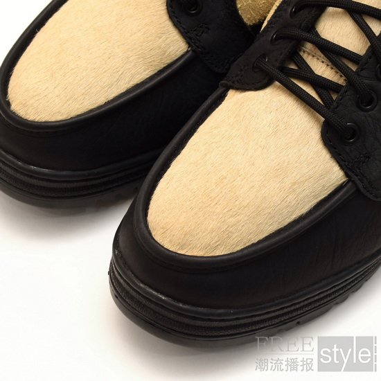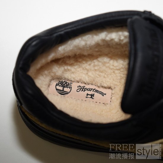 此次联名鞋款以黑色与奶油色为主调,鞋面以具有独特颗粒质感的黑色皮革打造,鞋舌与鞋头选用质感柔和的麂皮材质,鞋身侧面搭配短毛牛反绒,三种材质碰撞出层次丰富的视觉效果。鞋款内衬与鞋垫均采用柔软保暖的绒面内里,提供舒适贴合的冬季穿着体验。细节处更藏巧思,鞋身及吊牌压印有Timberland与the Apartment的双品牌标识,尽显精致匠心。需要特别说明的是,本次版本不同于原版Moc Toe靴型,未搭载GORE-TEX防水机能,更侧重日常穿搭的质感与风格表达。