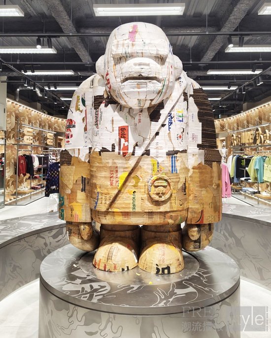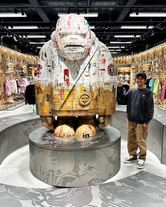 店中央矗立的AAPER 军团成员ALDO艺术雕塑作品,由日本艺术家仪间朝龙所匠心创作。这个作品采用来自全球各地的可回收纸板制作,不仅探索了环保理念的艺术表达,更象征着大阪心斋桥作为世界文化交流纽带的独特地位。仪间朝龙分享到:“我希望打造一件只属于这里的艺术品。虽然创作的过程充满挑战,但最终的成品真的很酷。”这件独一无二的艺术臻品,让AAPE心斋桥专门店成为让每一位时尚、艺术与文化爱好者必去的潮流目的地。