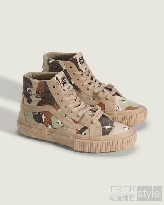 其中,Vans 标志性的 Sk8-Hi 鞋款在此次联名中焕发硬朗新姿。鞋身采用厚实帆布材质打造,并融入以功能为导向的设计元素:重新构思的侧边条纹同时兼作鞋带孔护片设计,强化包边与橡胶覆层提升耐用性。鞋底搭载 V 型齿纹外底,提供卓越抓地力与稳定支撑,兼具机能属性与风格表现。