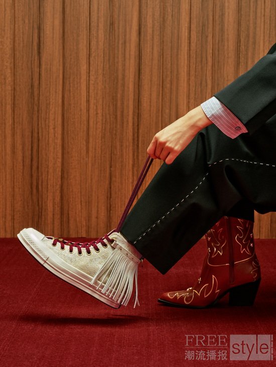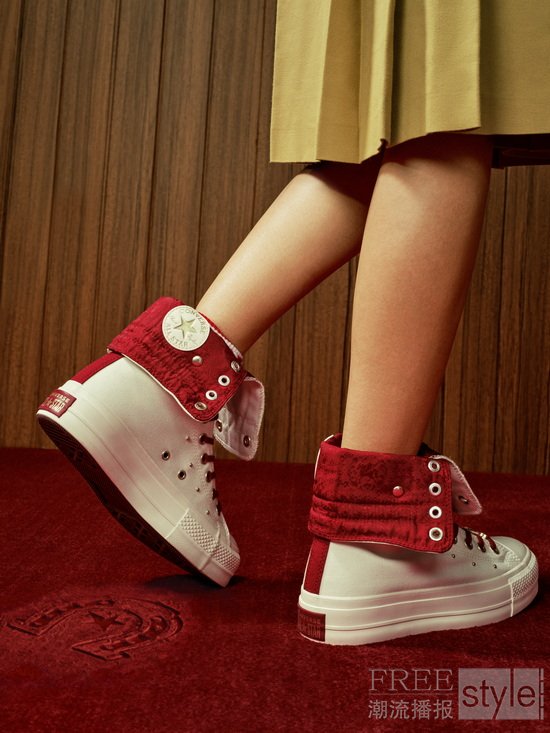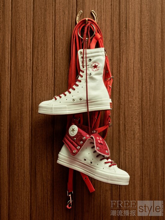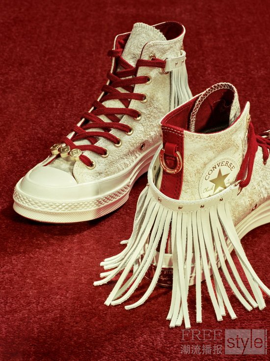 全新系列涵盖三款鞋履设计,以充满节日氛围的精致设计迎接农历马年的到来。Chuck 70 马年流苏版采用缎面质感织纹鞋面,搭配可自由拆卸的皮革流苏,红白配色邂逅鎏金马蹄 D 扣,在经典鞋型中勾勒出跃动之美。Chuck Taylor All Star Fold Over Lift 可翻折马靴版通过超高帮翻折结构塑造醒目轮廓,耐磨帆布与绗缝翻折营造丰富层次,加高中底和两副超长鞋带进一步彰显个性气场。Run Star Trainer 马年流苏版则以内嵌流苏鞋舌呼应系列主题,流畅线条延续复古运动风格,三层记忆云感鞋垫确保步履轻盈舒适,鞋跟星箭标与马蹄 D 扣细节暗藏巧思,让好运一路相随。