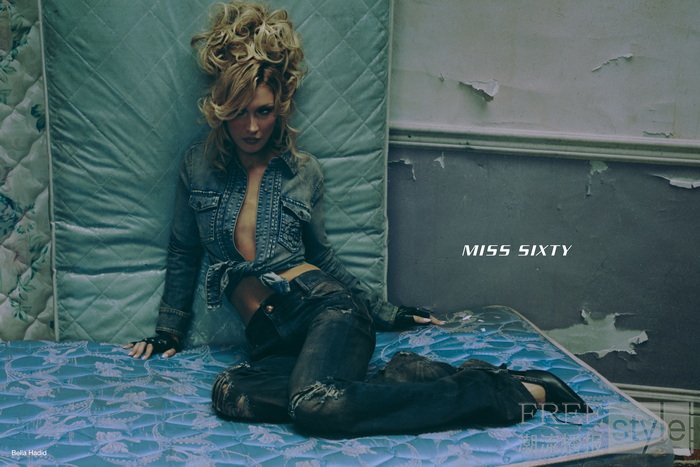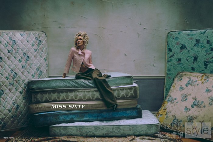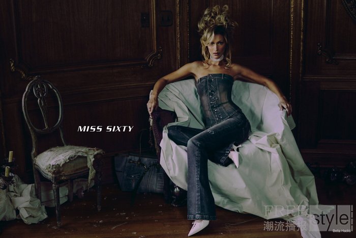 而全球代言人Bella Hadid则在摄影师Gabriel Moses的忧郁氛围镜头下,化身当代版玛丽·安托瓦内特(2026春季MISS SIXTY设计灵感来源)。不同于传统印象中洛可可奢华的脆弱符号,她以叛逆姿态打破时代的桎梏,在重构的“洛可可废墟”场景中完成自我表达,一座想象中的宫殿已沦为废墟,华丽又繁复的装饰成为过往的遗迹,层层叠叠的床垫之间,仿佛置身于《豌豆公主》的寓言故事中,凡尔赛水晶吊灯与法式奥斯曼装饰框定出一个浮华崩塌、叛逆生长的精神空间。在Bella的演绎中,柔美与颠覆激烈碰撞,她以朋克式的不羁锋芒重新解析玛丽皇后的现代意象,将MISS SIXTY的反叛精神完美诠释。