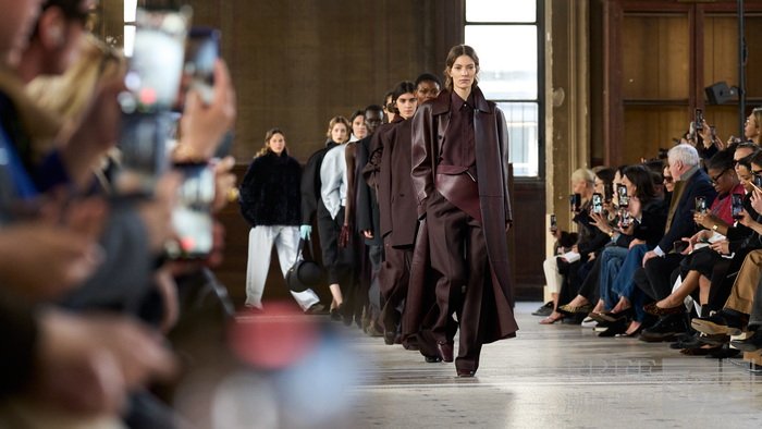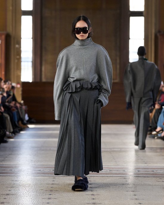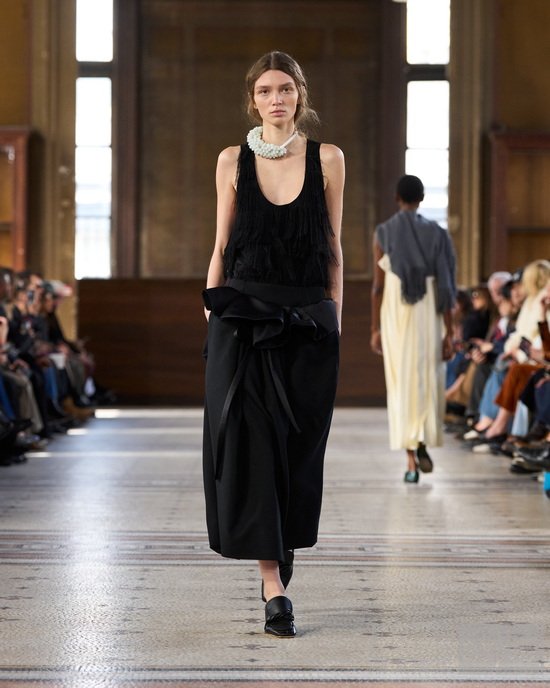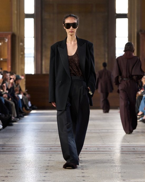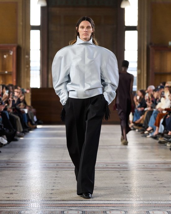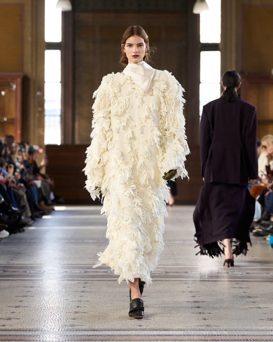 系列始于制服式裁剪,精准、权威,近乎严苛。外套的剪裁定义肩线、规整廓形。我从法式寓所的室内装饰中汲取灵感,以消解这份严谨——流苏、织物、壁毯、帷幔与毛毯——私密空间的元素,暗含松弛、层叠与浸润于日常的优雅。衣着穿行于公共仪式与私密日常之间。1950年代的高级定制,为系列注入雕塑感的女性气质——弧形肩缝构筑的圆润廓形,考究腰线,以及对工艺的虔敬。承继上季,我将经典形制以抽象的兰花形态重新诠释——花瓣被解构为体量与褶裥,而非具象的花卉再现。由此凝练出一种含蓄的感性符号——优雅,性感,兼具建筑感。
