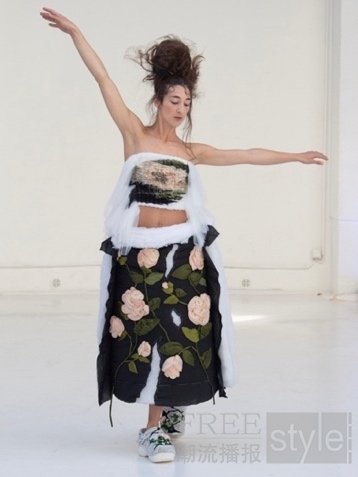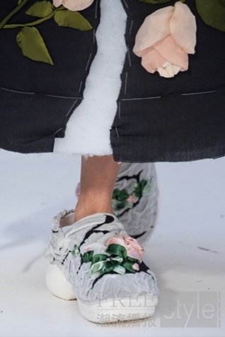 Crocs的经典鞋型小鲸鱼洞洞鞋在Caroline的设计美学中被重新诠释:定制针织鞋面打造裂纹效果,丝缎花朵从中绽放。每一朵花都由手工刺绣完成,仿佛从裂隙中自然生长——象征温柔从破裂中新生。