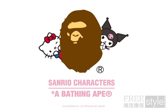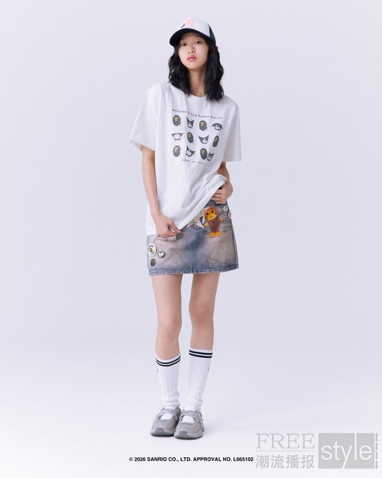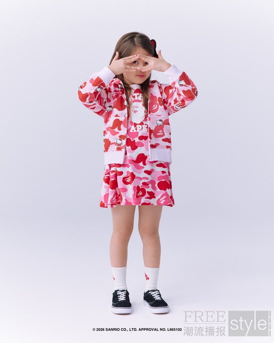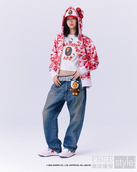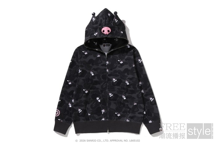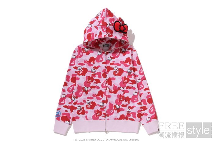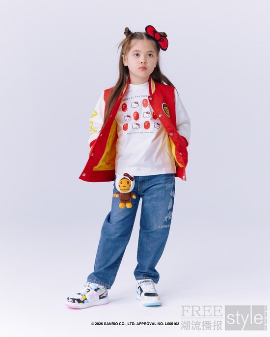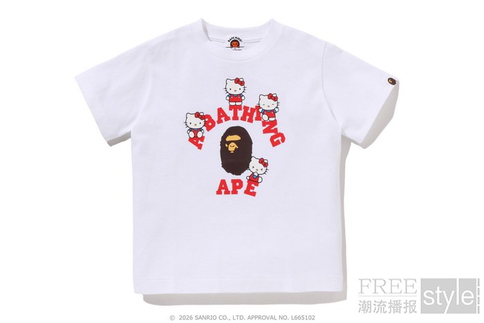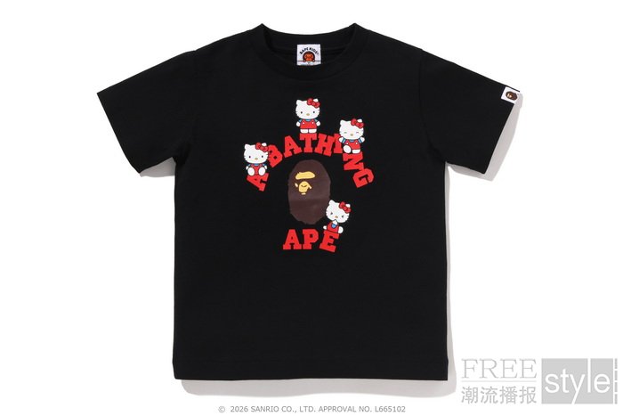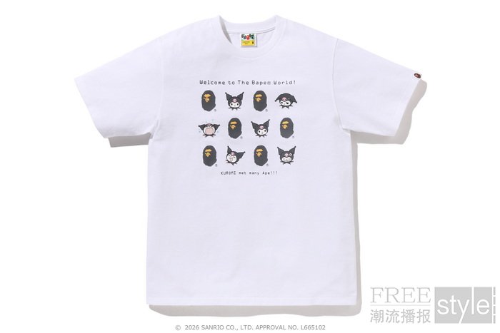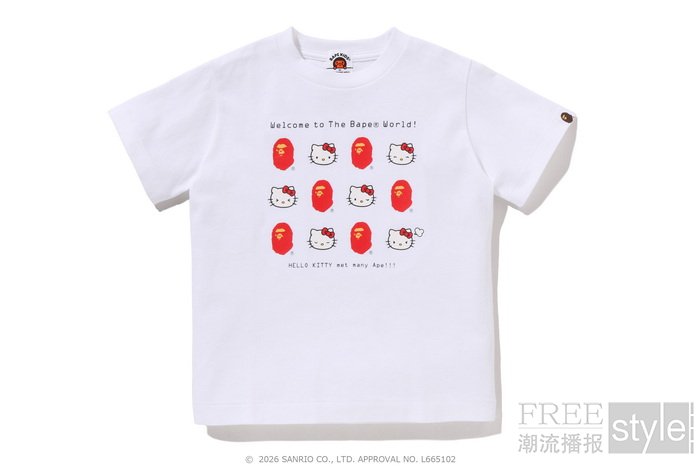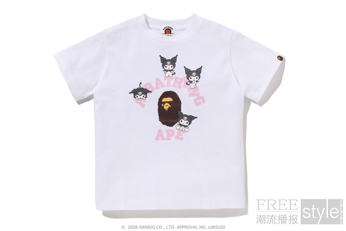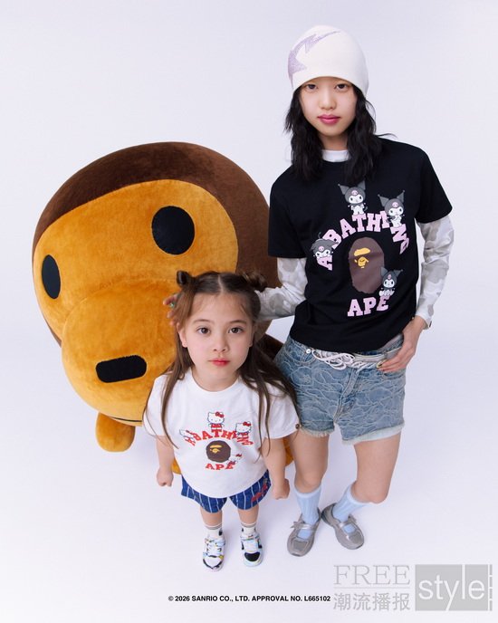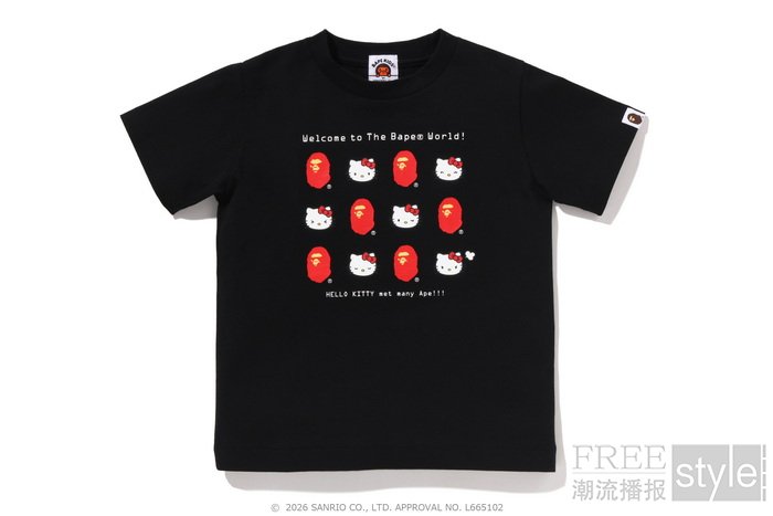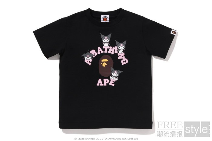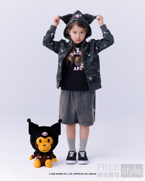 拉链帽衫以两大主角形象为蓝本,满幅联名迷彩印花锁定视觉焦点,饰以立体耳朵、粉色骷髅图案以及蝴蝶结毛绒发卡,增添灵动俏皮的玩味色彩。短TEE方面,一款以BAPE®︎官网首页标语「WELCOME TO THE BAPE®︎ WORLD」为灵感,将神态各异的HELLO KITTY、KUROMI与APE HEAD错落排列,背面则点缀尾巴印花,为整体点睛添彩;另一款则再现HELLO KITTY和KUROMI嬉戏玩闹的可爱瞬间,为经典COLLEGE图案注入活力,背面搭载「GO APE!」对话框细节,尽显潮流趣味。