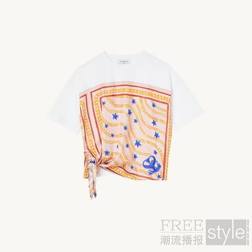 王心凌同款印花系带T恤与高腰阔腿牛仔裤于Sandro各大店铺和线上商城有售。