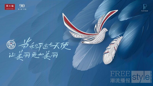 2019年8月,周大福与国际铂金协会(PGI®)合作推出了“和平天使”系列铂金首饰新品,以庆祝其成立90周年。 周大福相信,珠宝不仅是一件简单的贵重物品或漂亮闪耀的装饰品,亦是女性态度和信念的外在传达。该系列以铂金为设计基础,以展翼和平鸽与象征天使羽翼的羽毛形象为设计蓝本,以中国传统珐琅工艺为亮点,代表内在坚韧,外在温婉,内外兼修且优雅从容的女性气质。这是周大福首次将这两种材质相结合,以铂金的纯净柔韧与珐琅的热情勇敢,为独立女性献上由衷的致敬和礼赞,也是对追求梦想的年轻女孩们的喝彩和鼓励。 该系列产品目前已在中国2,000多家门店有售,在巴黎时装周的展示亦大获成功。