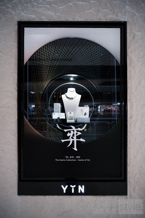YIN隐 王府中環店内的珠宝作品,按照宇宙天文、科技未来、人文艺术、自然地理等主题分类陈设,仅在此店特别展示了限量款的「隐」系列莫比乌斯环鸡尾酒戒指,及「弈」The Game Collection对弈系列围棋主题限量版珠宝作品,由和田玉中的碧玉与金制成。