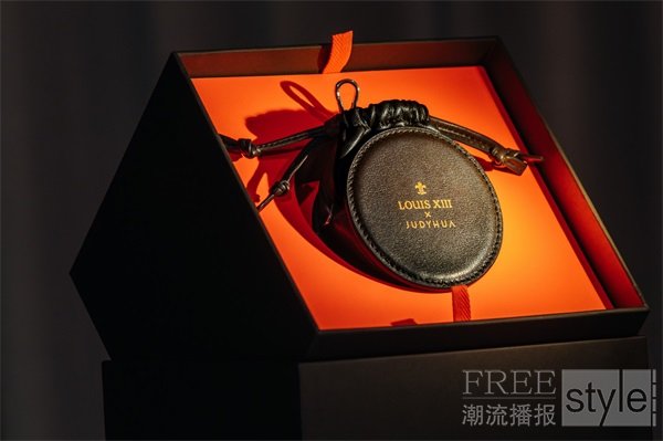 LOUIS XIII X JUDYHUA 联名款 THE DROP 珍粹装(单支装),灵感源于时间的流动与永恒。它以天然皮革为媒介,封存自然与时间的对话。圆形设计,象征完整与和谐。荧光橙与路易十三生命之水的琥珀色碰撞,进发视觉张力。更酷的是,它配有可拆卸肩带,可自由切换手持、肩背或悬挂佩戴。既是珍藏,也是随身的个性宣言。