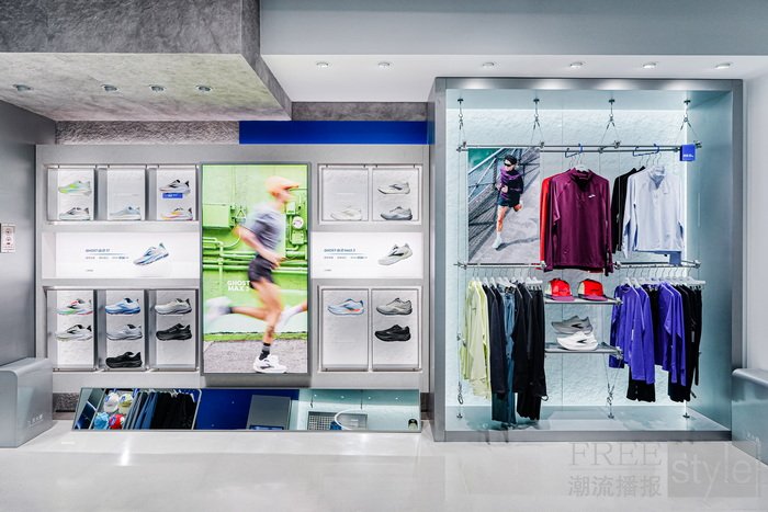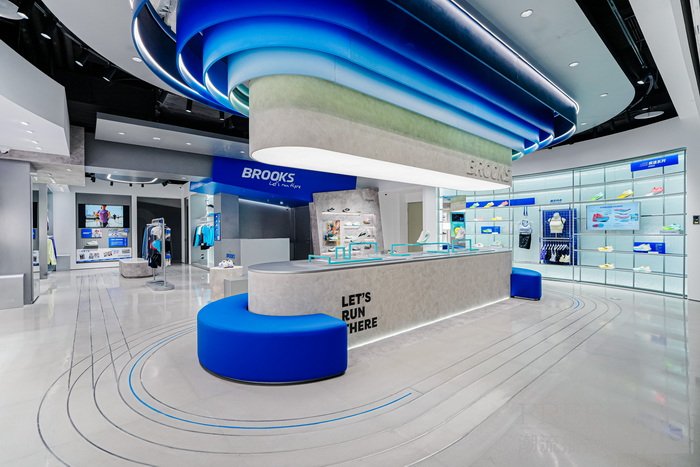 在空间呈现上,门店大量运用微水泥、哑光金属、超白玻璃与LED发光装置等材质,营造出冷静而克制的未来感基底,让图形语言与产品本身成为视觉焦点。灯光与结构形成有节奏的呼应,将抽象的运动能量转化为可被感知的空间体验,使门店不仅是零售场所,更是BROOKS跑步哲学的立体化呈现。
