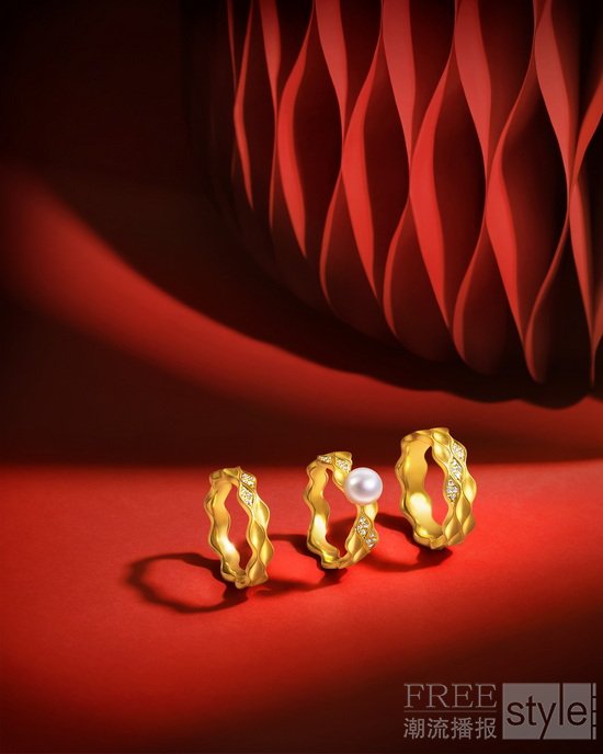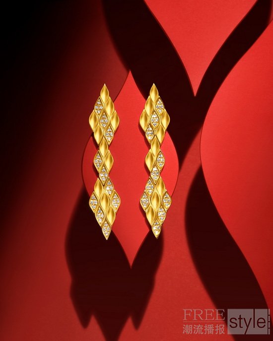 YuYu足金系列则与新春氛围相得益彰,温润黄金融合精湛喷砂工艺,精致榄尖图形簇拥延伸,呈现如缎质感,生动凝练游鱼的悠然姿态,将“有鱼有乐,丰衣足食”的美好祈愿化为细腻安然的陪伴,使传统年俗更具温度,更以优雅现代的造型点亮过年穿搭。