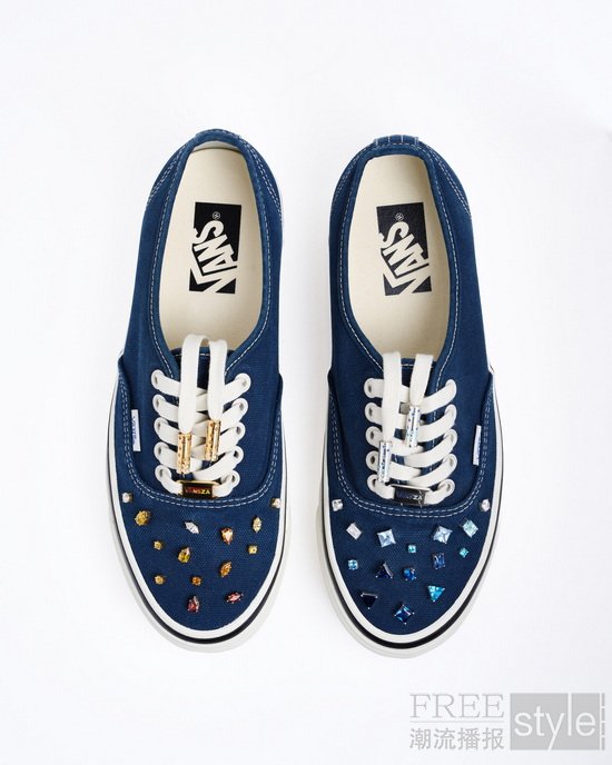 其中,此次亮相秀场的 “Ladybug Garden” 定制鞋款以白色 Authentic 44 鞋型呈现,鞋带饰扣上镶嵌着黄色与橙色黄水晶、粉色蓝宝石、祖母绿及橄榄石。其余四款设计同样别具匠心:“Enchanted Forest” 采用 Old Skool 36 鞋型与 Le Marais Forest 配色,融入了孔雀石、紫水晶、粉色蓝宝石、褐色托帕石与蛋白石;“Radiance” 亦选用 Old Skool 36 鞋型,以 Le Marais Black 为底色,点缀钻石与蛋白石;“Camo / Earth” 同样基于 Old Skool 36 鞋型打造,搭配 Le Marais Bungee Cord 配色,结合褐色托帕石、棕色钻石、祖母绿、孔雀石、星光蓝宝石、珍珠、石英及月光石;而 “Temperature Ctrl” 则回归 Authentic 44 鞋型,采用海军蓝配色,饰以白色、黄色、橙色与蓝色蓝宝石,并辅以黄色黄水晶与石榴石。
