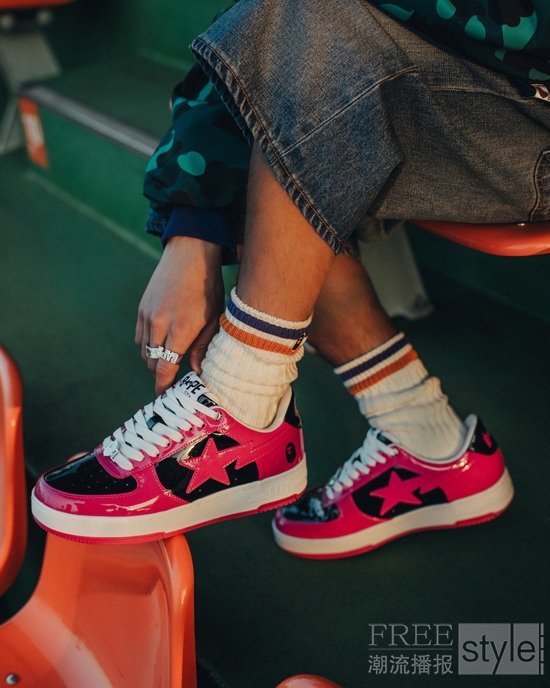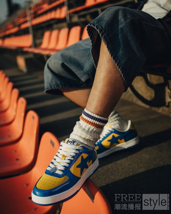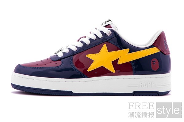 时值2026年世界杯热潮持续升温之际,此番特别呈现蓝/红、蓝/黄、紫红/黑三款撞色设计,向传奇球队的经典配色致敬。每款设计皆以纯粹街头语言重构赛场荣光,为球迷与潮流玩家提供表达热爱与个性的多元选择。鞋身采用 BAPE®标志性的奢华漆皮打造,以闪耀光泽释放极具冲击力的现代质感,令经典 BAPE STA™在绿茵之外,亦成为大胆瞩目的风格旗帜。