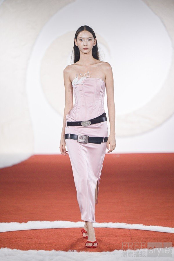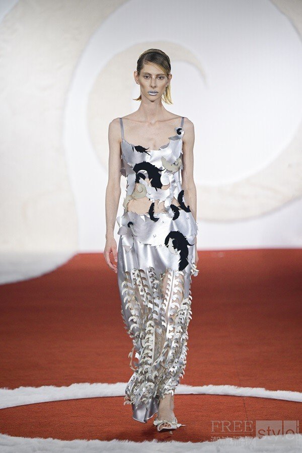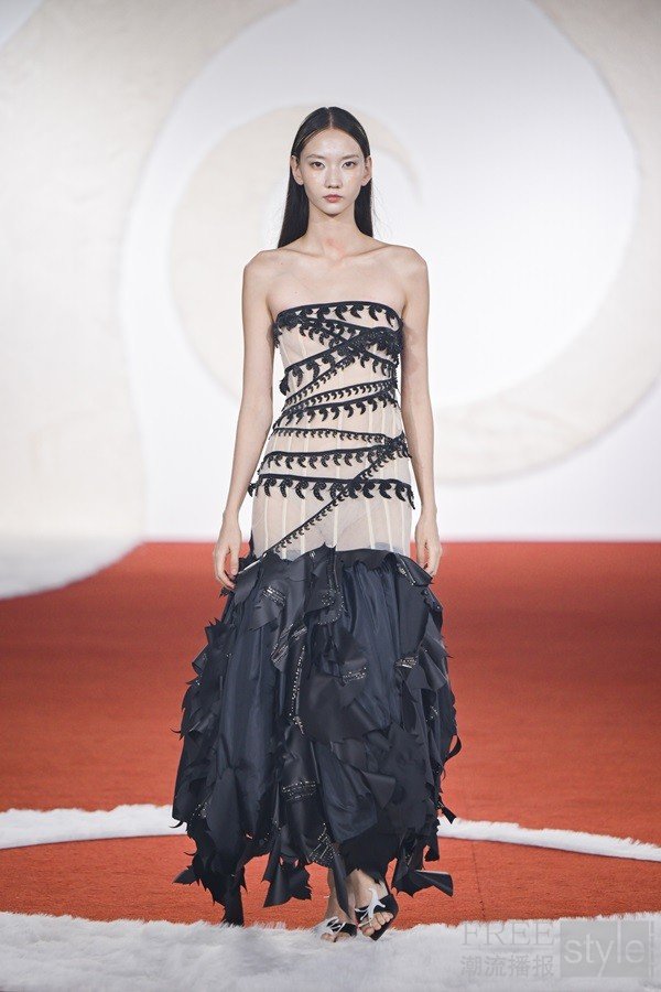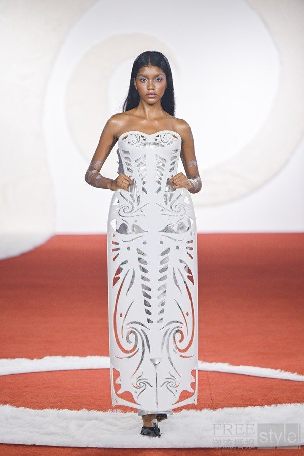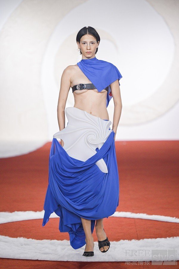 在材质上,品牌以海洋与羽毛元素为灵感,研发出独有的激光切割图案,贯穿于成衣与秀款线之中。所使用的环保丝绒皮革经由正反复合后再切割,使得面料两面皆呈丝绒质感,带来温柔却坚毅的触感。部分造型加入螺旋钉珠细节,将“解构的螺旋”从三维的打印延伸至二维的线迹——构筑出秩序与有机的平衡。