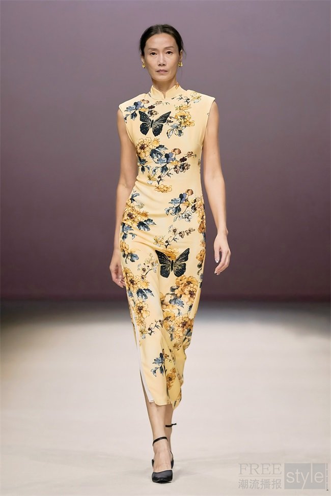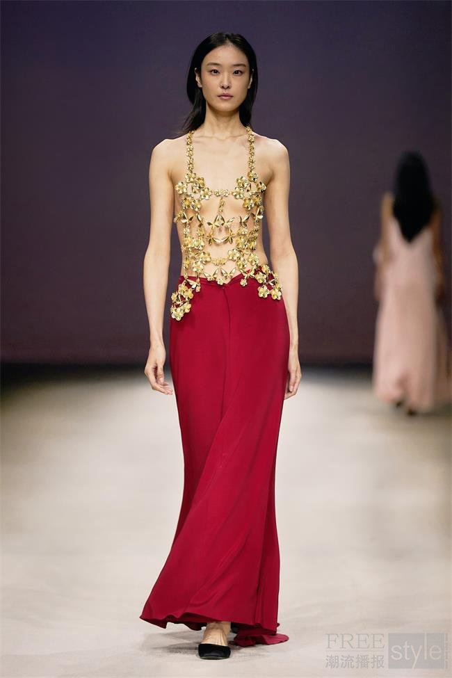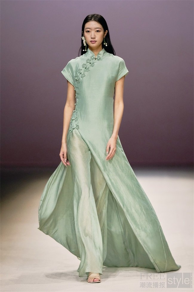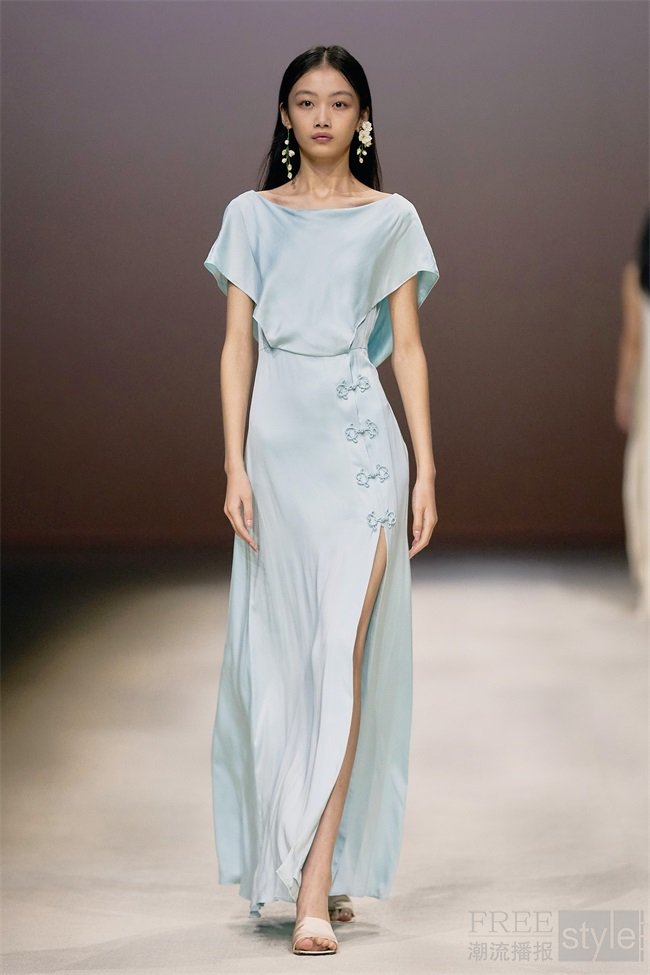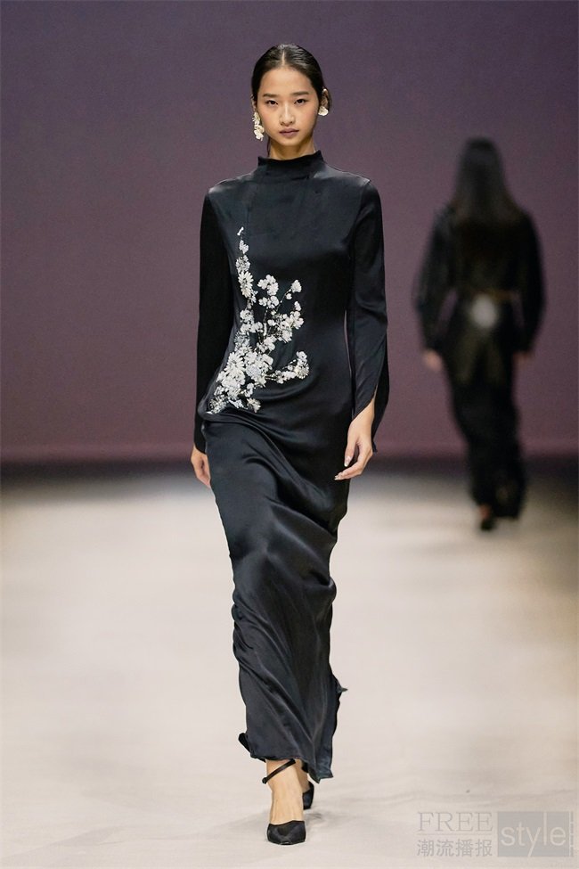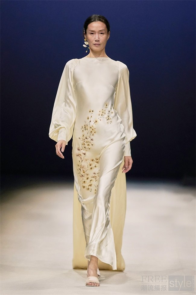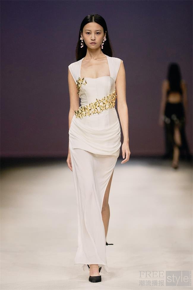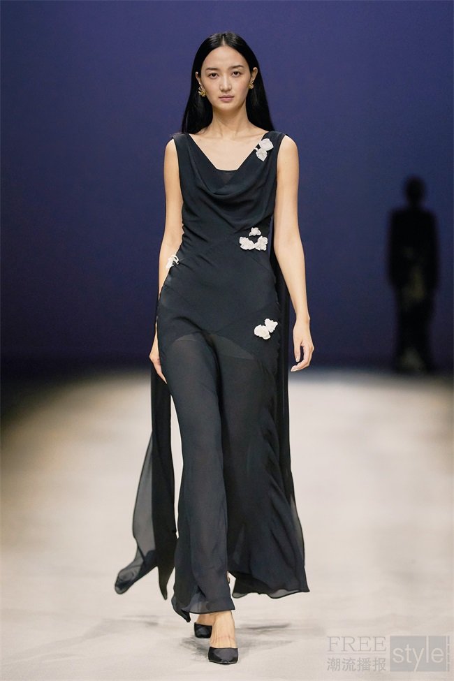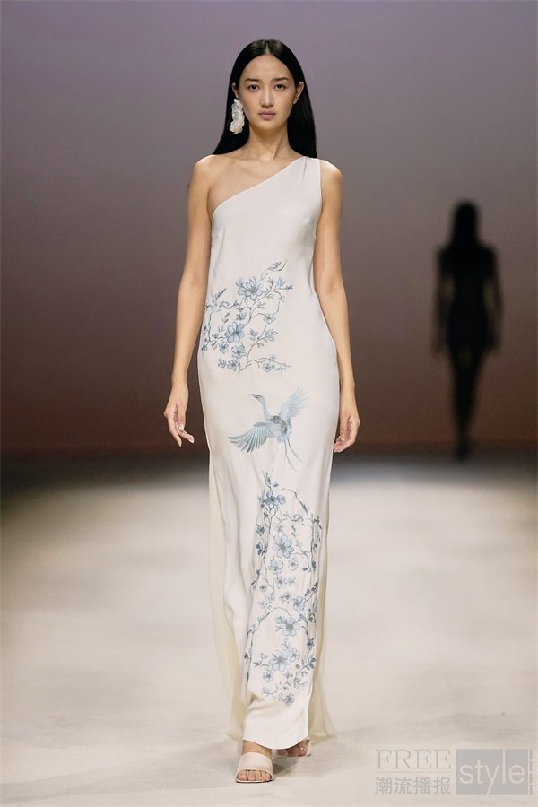 在这样的叙事语境中,每件作品都承载着“蜕变”的意象。设计师从中国古代服饰的宽袍飞袖与流动线条中汲取灵感,选用轻盈飘逸的纱与丝绸,重现那份温柔而空灵的东方记忆;以古画中花鸟的神韵为灵感,将手工刺绣与繁复珠饰融入设计,让画作中的细节在现实中栩栩如生地重现——这是一场历经千年的“化蝶之旅”。
