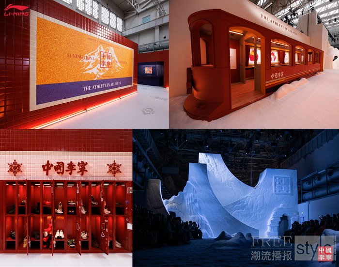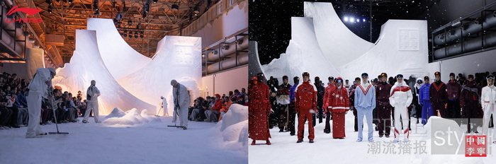 中国李宁2026秋冬大秀,以一段沉浸式场景开启旅程,这段体验始于充满复古气息的高山火车站氛围,检票口、站台指引牌、候车厅以及长廊尽头的小火车,无不唤醒宾客对经典冬季运动场馆的记忆,途经的小火车内还陈列了承载着李宁品牌高光时刻的经典领奖服展区,回溯中国体育的荣耀时刻。随着宾客深入秀场空间,环境的肌理逐渐从怀旧与暖色调转向受雪原和跳台滑雪场地启发所打造的极致辽阔的纯白景观,这一渐变式体验逐步拉高观秀期待。主秀场是一个以冬季运动竞技场为原型的广阔空间,其动态轨迹与空间张力取自专业滑雪赛道与运动员在巅峰时刻展现出的行云流水的运动姿态。这场沉浸式大秀既植根于李宁深厚的运动基因,也呼应品牌向体育精神、中国体育荣耀时刻及冬季运动的过去与未来致敬的宏大叙事。