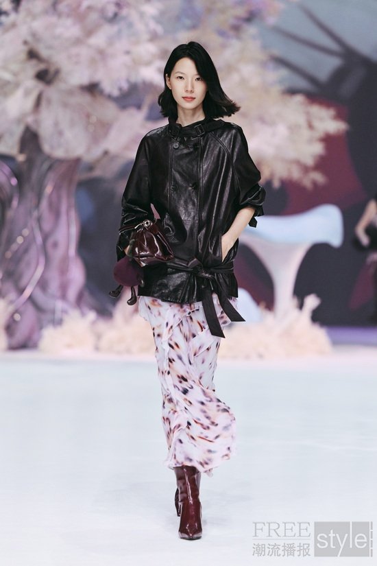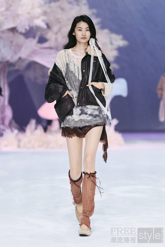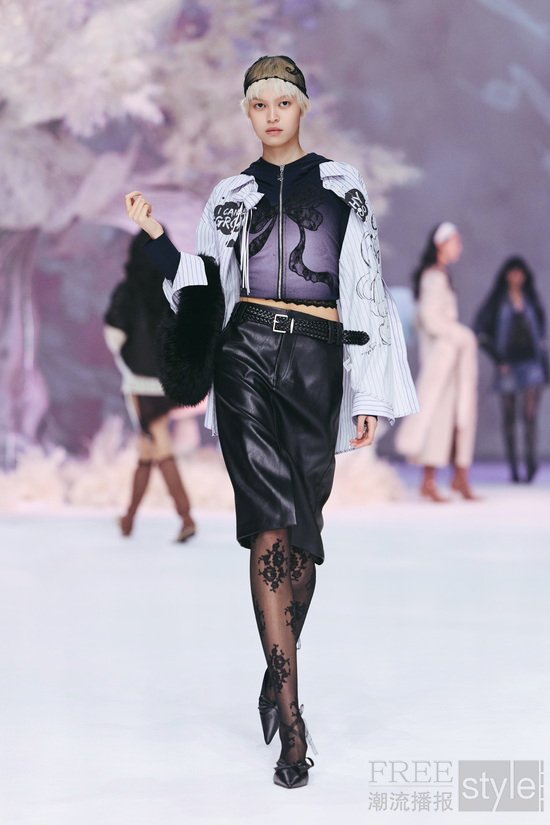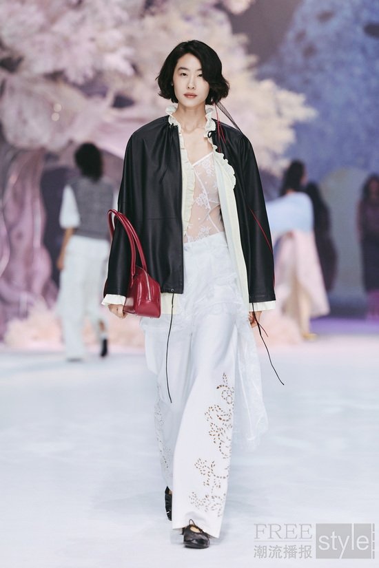 本次大秀 Key Look 以品牌专利花型蕾丝为核心,糅合前沿工艺打造而成,其中传承百年的 Leavers Lace(列维斯蕾丝)工艺更是点睛之笔,将专利花型蕾丝与双色复古蜡感小绵羊皮、超薄哑光小羊皮、硬挺亚麻、高支棉感面料等多元材质创新碰撞;复古蜡感羊皮机车皮衣、超薄哑光小羊皮廓形皮衣、亚麻大廓形白西装、植鞣皮收腰风衣等造型,皆以蕾丝拼接、内拼、暗纹点缀的巧思诠释「柔韧交织,反差时髦」,同时融入轻童话插画、甜酷晕染豹纹、手绘涂鸦等设计,在匠心工艺与趋势表达的平衡中,打造适配多场景的荷系风格。