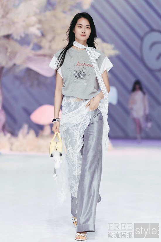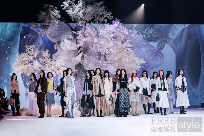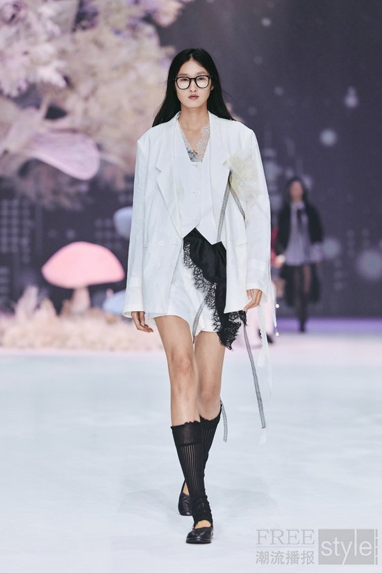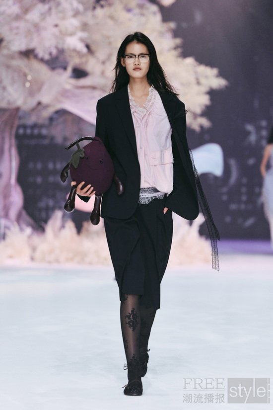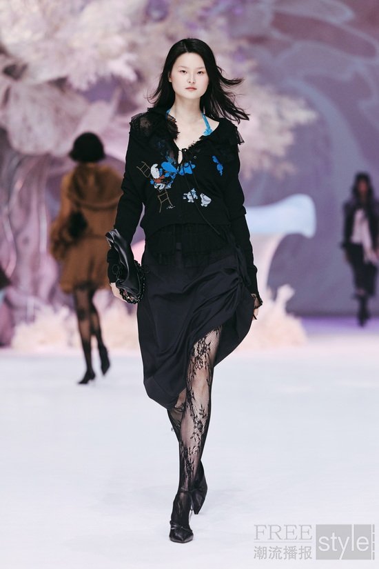 秀场以「成年人的童话」为叙事线索,构筑一处虚实交织的沉浸式空间。光影交织的基调之下,利落的建筑线条与品牌标志性蕾丝纹样的光影铺陈形成微妙的张力——柔软与硬朗、感性与克制在此交织,呼应品牌“柔韧交织,反差时髦”的核心理念, 并让现场嘉宾在沉浸式体验中感受当代女性的多元之美。