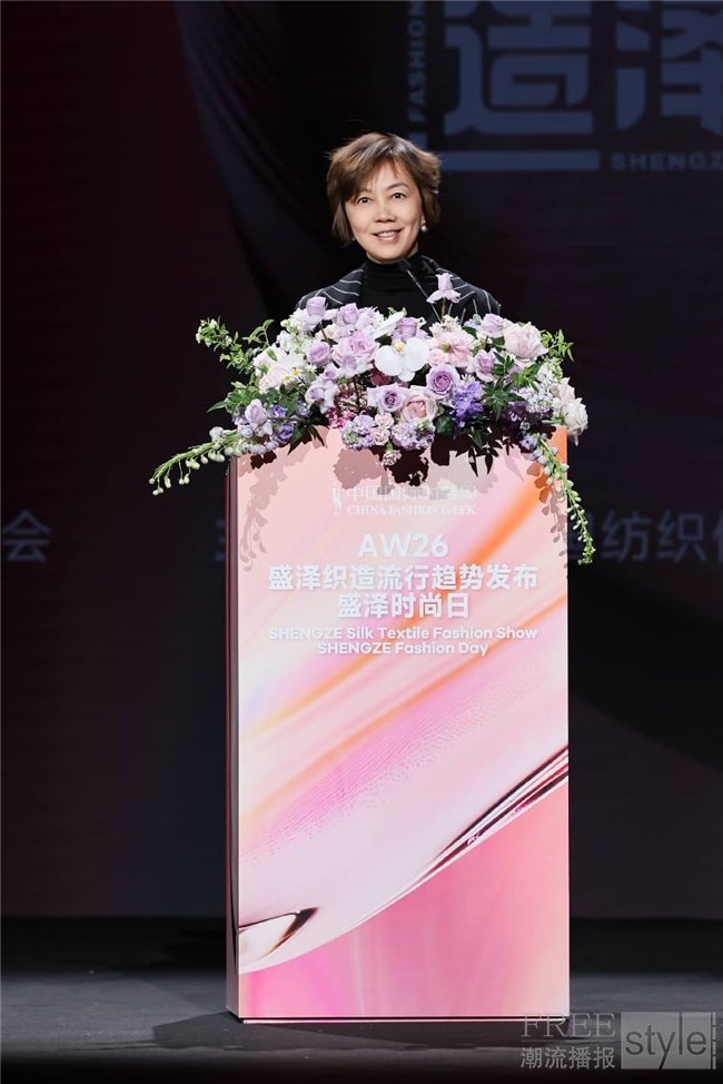 阎岩会长首先登台为活动致辞。她表示,盛泽今年在中国国际时装周再添春夏趋势发布,形成“秋冬+春夏”全季趋势体系,旨在以趋势引领、设计赋能打通面料研发与市场转化全链条,强化盛泽在全球纺织时尚领域的话语权。本次秀演汇聚盛泽本土优质面料企业成果,展现出“盛泽织造”区域品牌的力量。阎会长特别指出,2026年是“十五五”规划开局之年,盛泽作为“中国绸都”和全国纺织产业集群标杆,应以趋势为纲、设计为核、生态为基,抢占时尚话语权,锻造品牌竞争力,构建产业新优势。